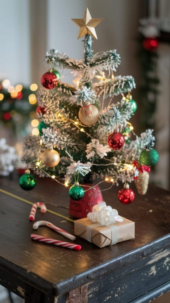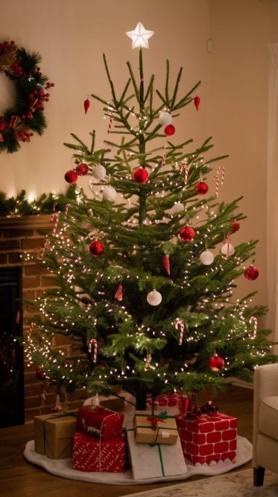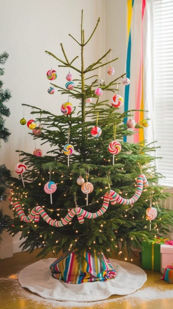 Turn your tree into a candy wonderland with decorations like lollipop ornaments, candy cane garlands, and pastel-colored baubles. Add fake snow for an extra sweet touch.