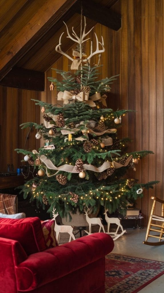 Bring nature indoors with a rustic woodland-themed Christmas tree. Decorate with wooden ornaments, pinecones, burlap ribbon, and faux antler decorations. Add warm white lights to enhance the cozy, earthy vibe.
