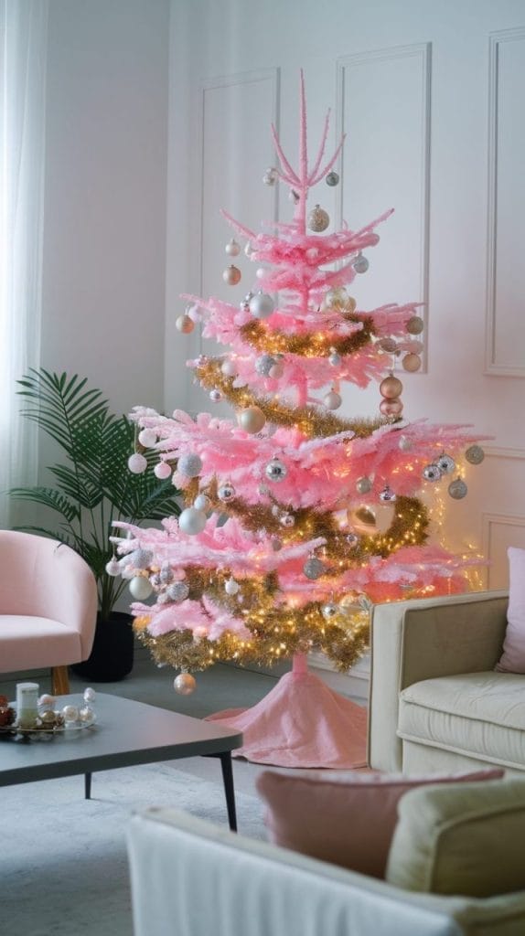 For a modern and playful vibe, decorate with a pink artificial tree or add pink ornaments to a green one. Pair pink baubles with silver tinsel and lights for a chic aesthetic.