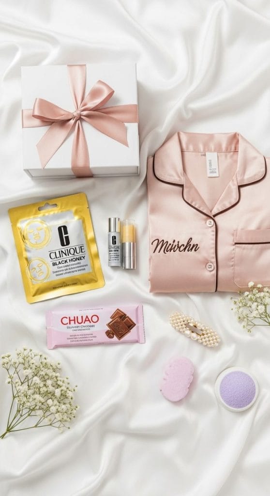 The centerpiece is usually something substantial—like the Clinique Black Honey tinted lip balm (that viral shade everyone’s obsessed with at $25), or a personalized silk pajama set with their name embroidered on it.