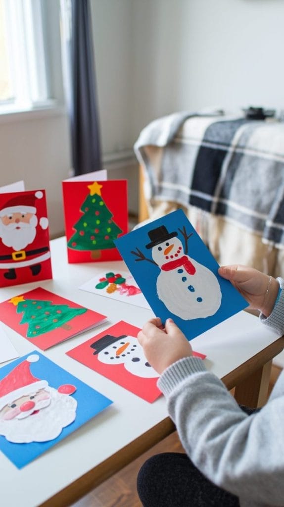 Making Process: Fold a piece of sturdy cardstock in half to create a card. Let kids dip their fingers into paint and create festive designs on the front of the card. Encourage them to write a holiday message inside for an extra personal touch.