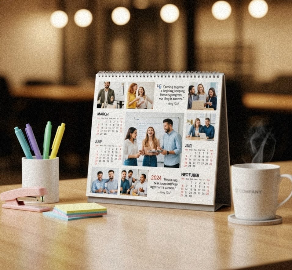 Instead of a standard photo calendar, create a monthly desk calendar featuring team photos, inside jokes, motivational quotes, and milestone moments from the past year. This is a thoughtful way to remind employees of shared achievements and fun times together while keeping it functional for daily use.