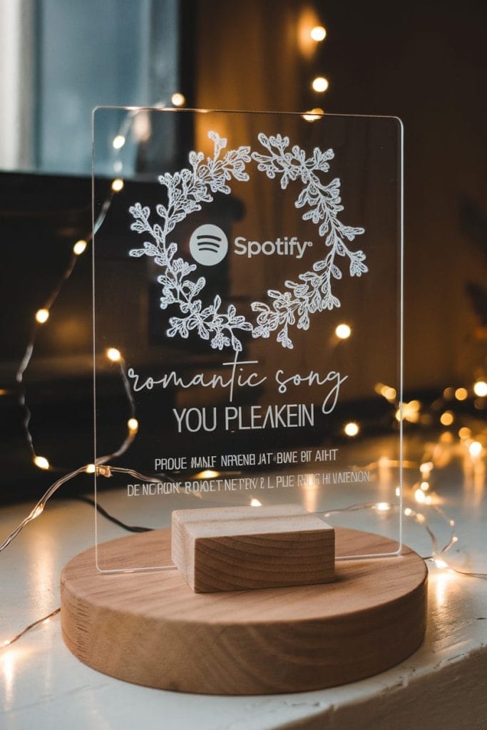 Making Process: Use a clear acrylic sheet or wood as the base and print or engrave the Spotify code for the chosen song onto it. You can decorate it with your names, the song title, or a small design to make it more personal. Spotify codes can be generated online for free.