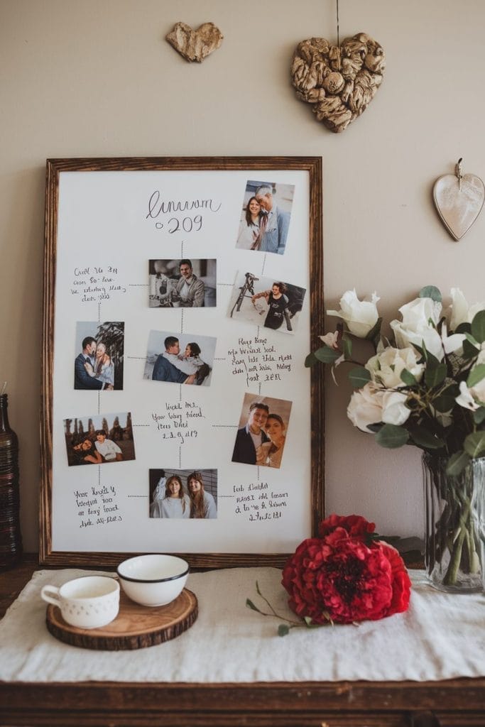 Celebrate your love story by creating a visual timeline that highlights key milestones in your relationship. Include dates and moments like when you first met, your first trip together, or your anniversary.