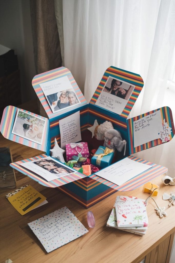 Create a pop-up explosion box that bursts open to reveal layers of photos, messages, and small surprises. This multi-layered gift is interactive and fun to open, making it perfect for Valentine’s Day.