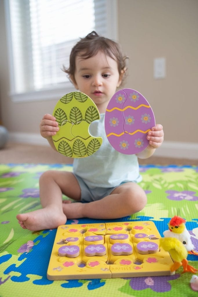Cut paper eggs in half with different colors or patterns. Kids match the halves. Bonus points for making them hunt for the pieces first!