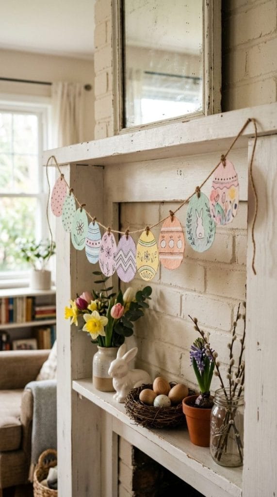 Cut egg shapes from scrapbook paper or painted cardstock, punch holes in the top, and string them along some yarn or twine.