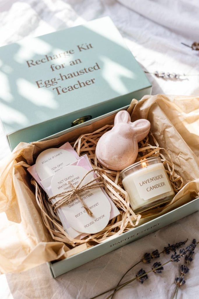 Create an Easter-themed self-care pack with calming tea bags, an eye mask, a mini journal, and a bunny-shaped bath bomb. Label it “Recharge Kit for an Egg-hausted Teacher.” A little humor + care = perfect gift!