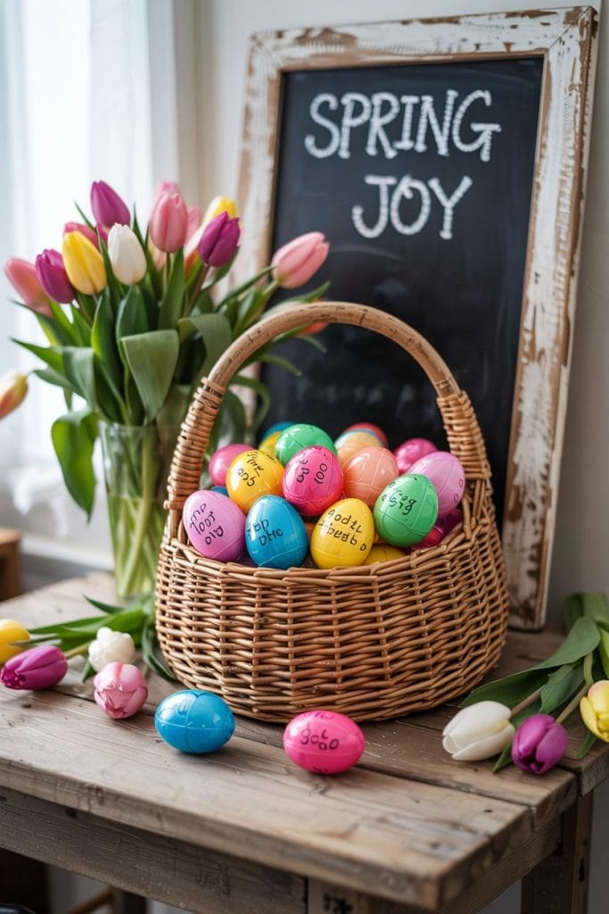 Making Process: Collect plastic eggs, ask students to write personal messages or doodles, and place them in a colorful basket with tissue paper.