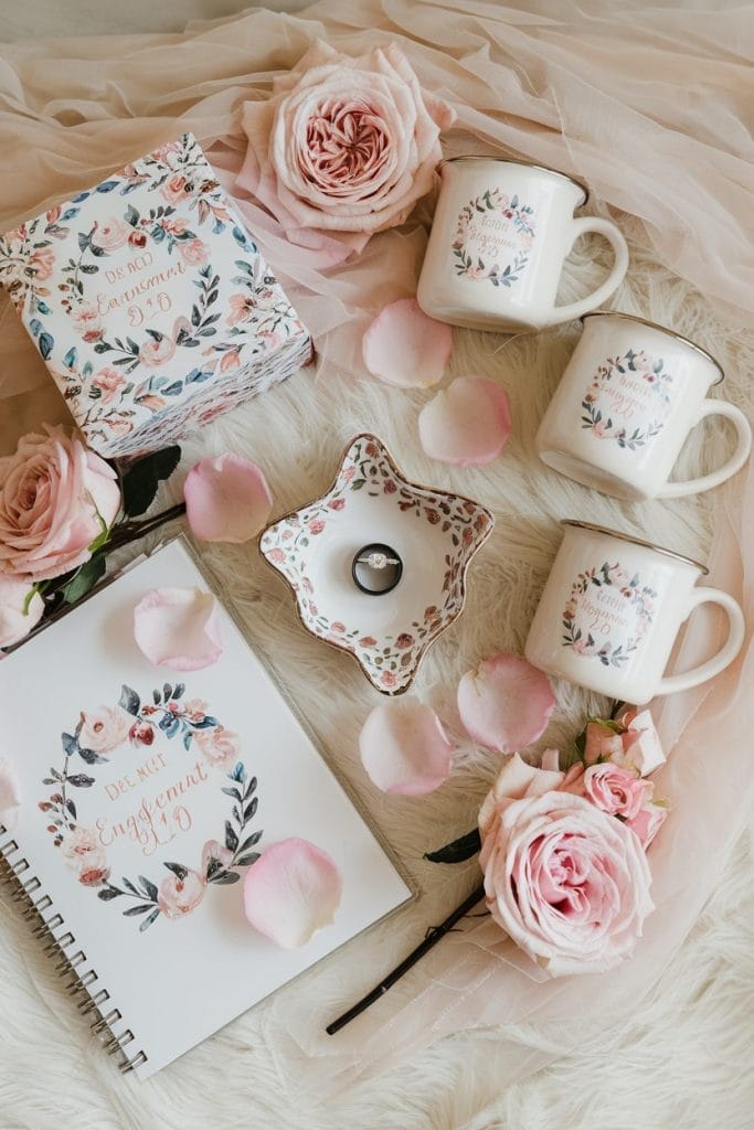 - Personalized engagement box with photos, snacks, and fiancé-themed goodies