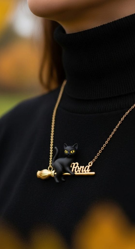 Bewitching name necklaces with matte black cats riding gold or silver broomsticks? That’s peak Halloween energy right there. Skeleton hand jewelry and skull rings with gemstones add edge without going full costume.