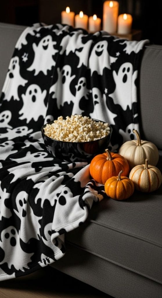 Throw pillows with vintage jack-o’-lanterns or elegant black cats add spooky vibes without making your place look like a Spirit Halloween exploded. Your couch will thank you.