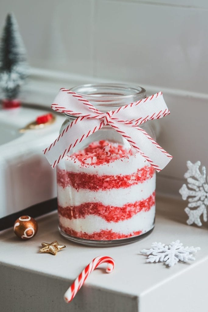 Making Process: Mix sugar, coconut oil, and peppermint essential oil. Optionally add a few drops of red food coloring to create a layered effect, then package in a jar with a label.