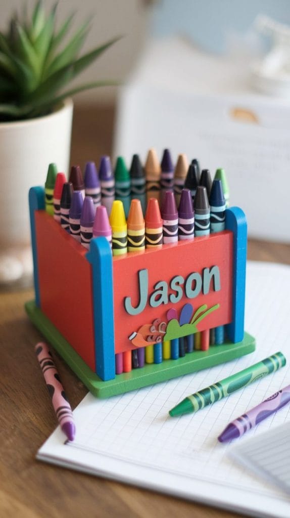 Make a crayon holder using wood or sturdy cardboard, personalized with the child’s name. This practical gift helps kids keep their crayons organized in a fun and colorful way.