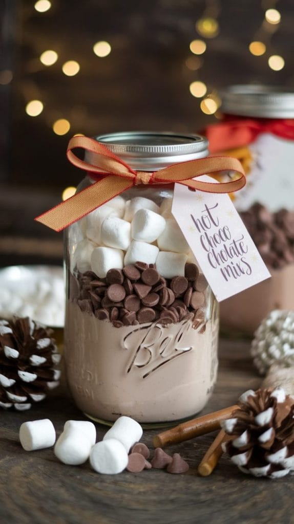 Layer hot chocolate powder, mini marshmallows, and chocolate chips in a mason jar to create a cozy, homemade treat. Add a ribbon and a festive tag with instructions for preparation. This gift is easy to make and perfect for warming up during the cold winter months.