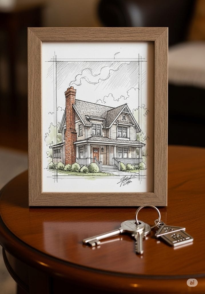 A hand-drawn or digitally illustrated portrait of the new home adds a deeply personal and artistic touch.