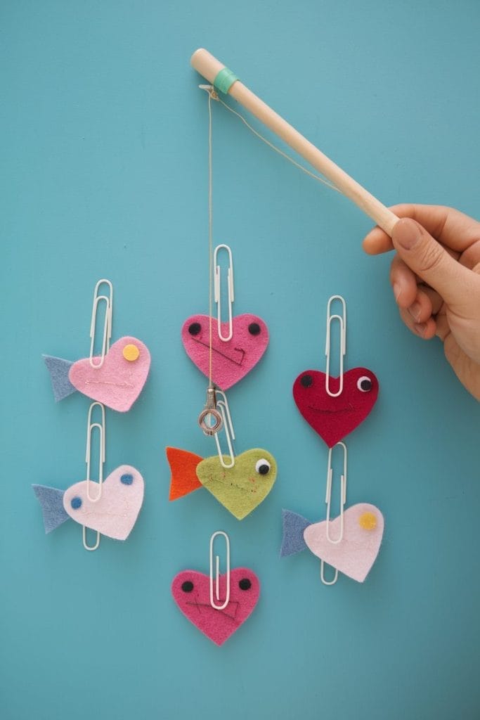 Create DIY heart-shaped fish from felt or paper, attach small paperclips, and include a magnetic “fishing rod” made from a wooden dowel and string. Add a cute message like, “I’m Hooked on You, Valentine!”