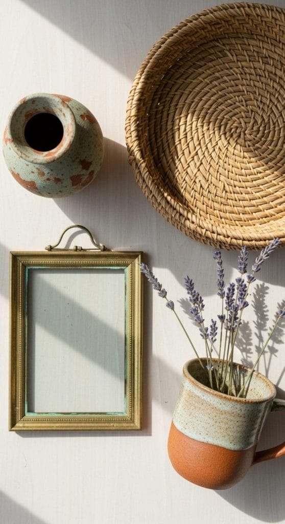Look for ceramics in earthy tones, woven baskets, quirky candle holders, and vintage frames.