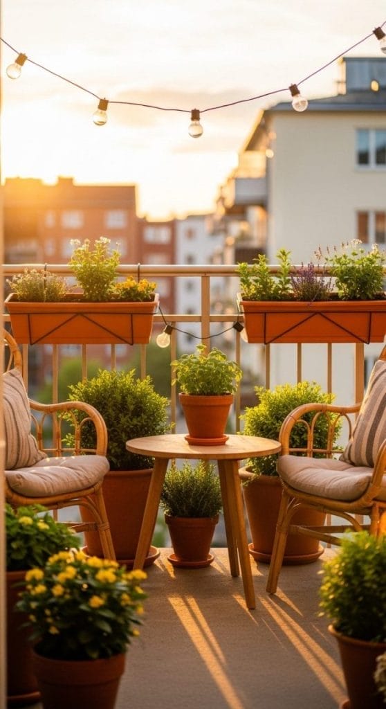 A weather-resistant rug, a couple of cushioned chairs, string lights or lanterns, and some potted greenery.