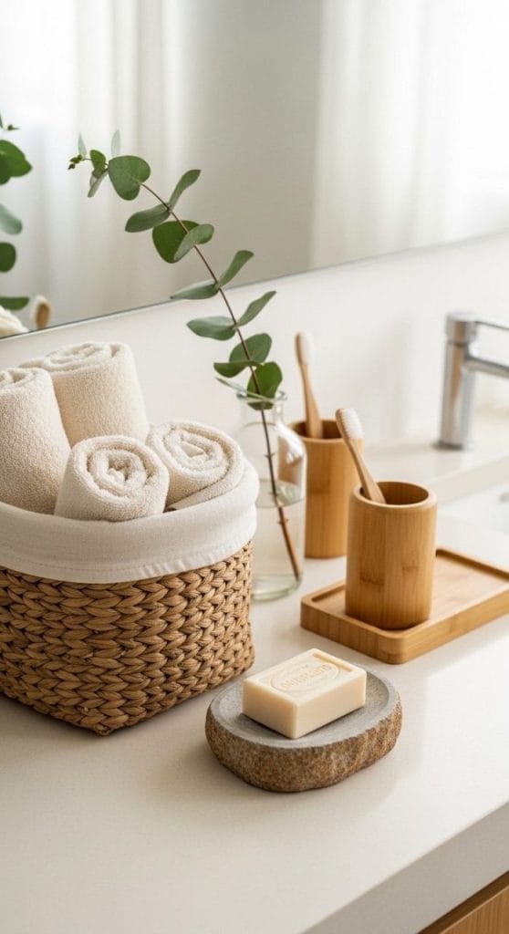Think natural stone accessories, wood accents, soft lighting, and minimal clutter.