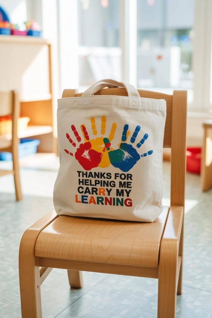 Making Process: Press the child’s painted hand onto the tote bag, let dry, then add designs and a thank-you note with fabric-safe markers or paint.