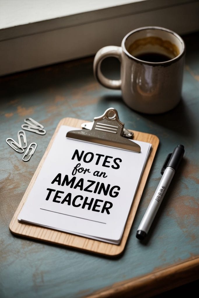 Turn a small clipboard into a reusable dry-erase board by adding a decorated sheet under a clear plastic sleeve or lamination. Write “Notes for an Amazing Teacher” on it and include a mini dry-erase marker.