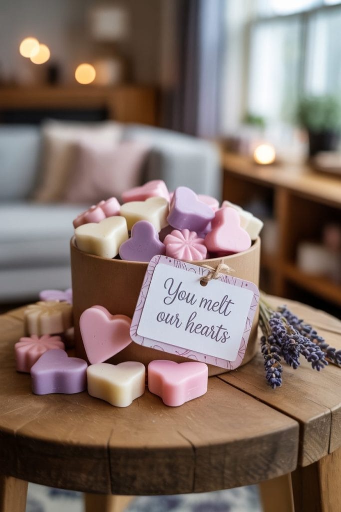 Craft homemade wax melts using essential oils and pour them into fun molds. Package them in a small hand-decorated box with a tag that says, “You melt our hearts!”