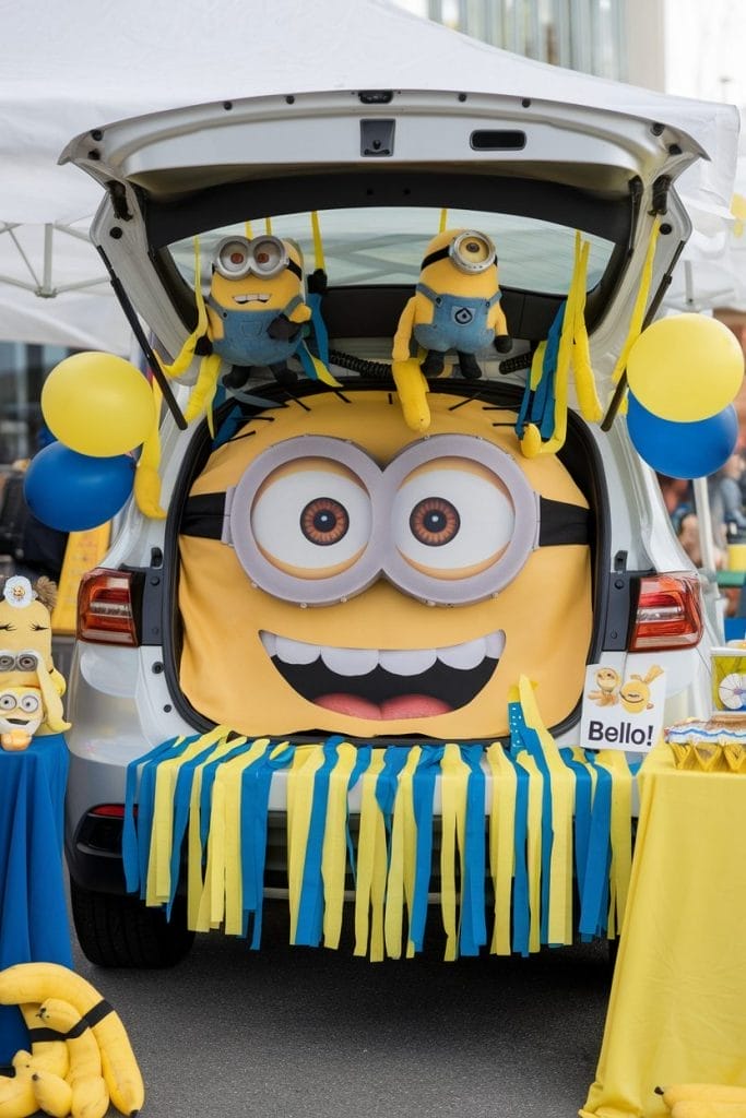- Minions Everywhere: Place plush Minions or cutouts all over the trunk. You can hang them from balloons or fishing wire to make it look like they’re flying or floating. Add bananas, since Minions love bananas, either as props or cutouts.