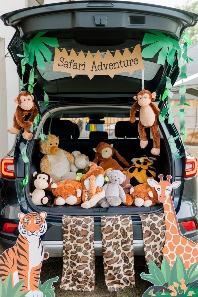 Start by creating the ark itself by adding brown paper or fabric to the back of your trunk to mimic wood. You can even build a simple cardboard ark shape around your car for extra flair.
