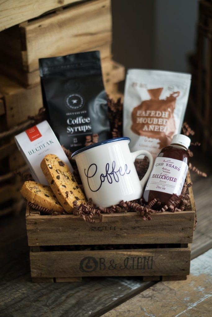 What to Include: Fill the basket with premium coffee beans, a manual coffee grinder, or a portable French press. Add a custom mug with a personal message or design, flavored coffee syrups, and biscotti or cookies. For an extra treat, include a bag of chocolate-covered espresso beans.