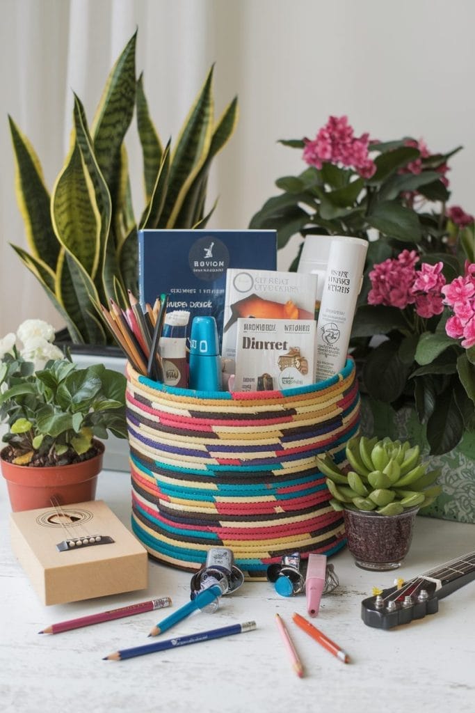 What to Include: If he’s into art, include sketchbooks, pencils, or paint supplies. For music lovers, add guitar picks, sheet music, or a vinyl record. Gardeners will appreciate gloves, seeds, or small potted plants. Include a few snacks or drinks that complement the theme.