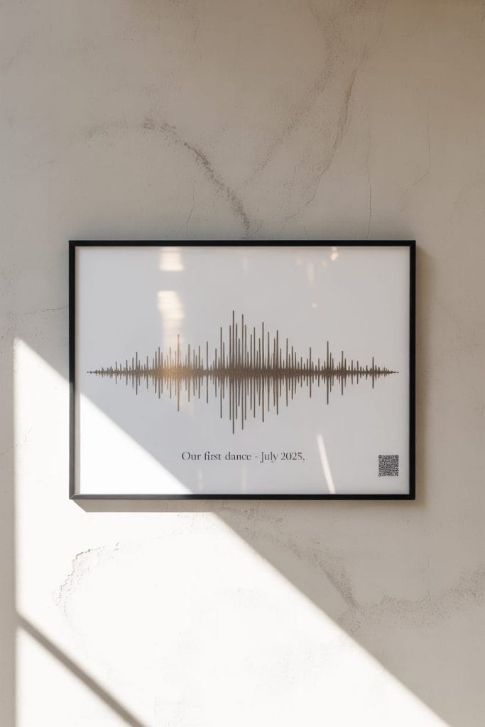 Capture the audio of their vows, a meaningful quote, or their first dance song and convert it into modern wall art in the shape of a soundwave. Add a QR code on the frame so they can play the audio with a scan.