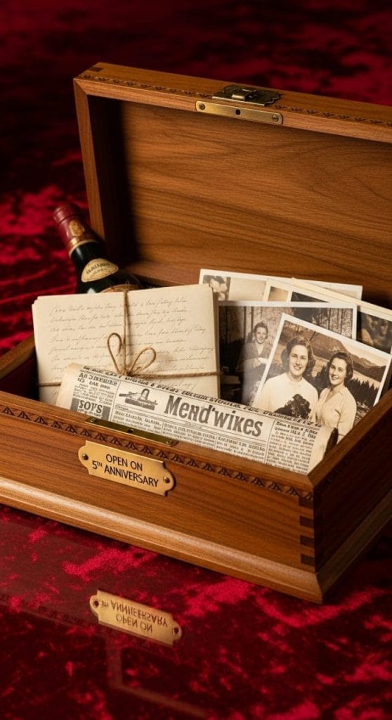 Include current photos, letters from their friends (coordinate this secretly), a newspaper from their wedding day, a bottle of wine that’ll age well, and maybe some predictions about their future written by their wedding party.