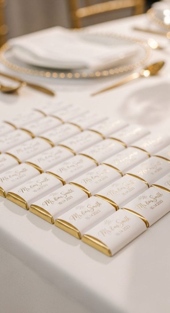 Mini chocolate bars with custom wrappers or individually wrapped cookies are wedding favor gold. They’re budget-friendly (often under $2 per person), travel well, and here’s the best part: people might eat them before they even leave the venue.
