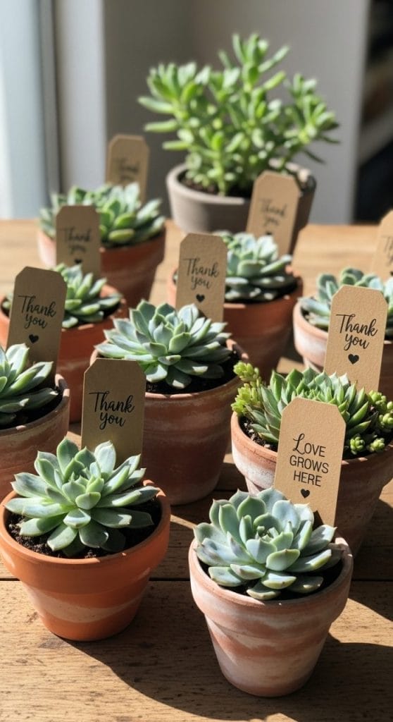 Set them up as part of your tablescape so they pull double-duty as decor and favors. Your guests get a mini plant, you get natural decorations, and nobody has to haul personalized shot glasses home on an airplane.