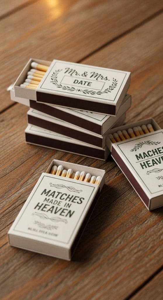These are super affordable and genuinely useful. Everyone needs matches for candles, grills, or camping. Get custom matchboxes with fun designs (skip the names and date) and you’ve got favors that cost under $2 each but feel thoughtful.